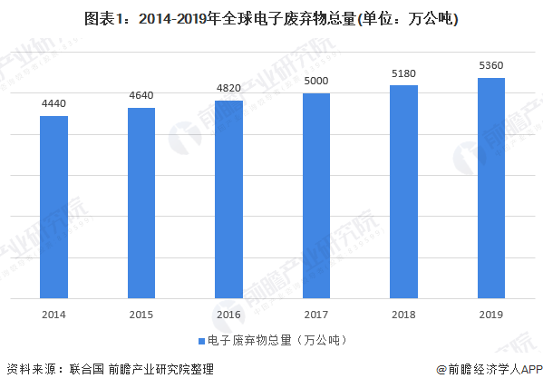 2014-2019年,全球電子廢棄物總量不斷增加?!?020年全球電子廢棄物監(jiān)測(cè)》報(bào)告顯示,2019年全球產(chǎn)生的電子廢棄物(帶電池或插頭的廢棄產(chǎn)品)總量達(dá)到了創(chuàng)紀(jì)錄的5360萬(wàn)公噸。