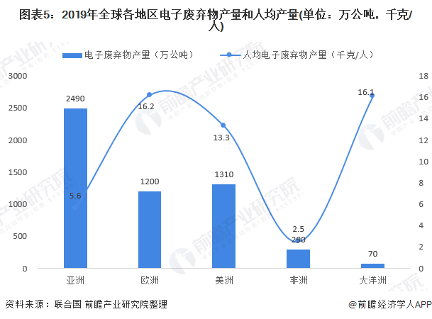 亞洲電子廢棄物數(shù)量第一,歐洲人均電子廢棄物產(chǎn)生量第一