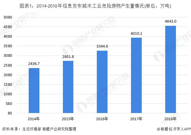 根據(jù)生態(tài)環(huán)境部發(fā)布的《全國大、中城市固體廢物污染環(huán)境防治年報(bào)》數(shù)據(jù)顯示,2014-2018年信息發(fā)布城市工業(yè)危險(xiǎn)廢物產(chǎn)生量逐年上升。2018年,200個(gè)大、中城市工業(yè)危險(xiǎn)廢物產(chǎn)生量達(dá)4643.0萬噸。
